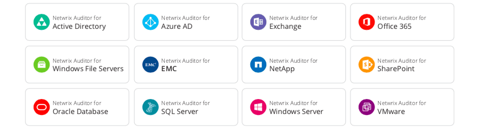 Netwrix Auditor includes applications for Active Directory, Azure AD, Exchange, Office 365, Windows file servers, EMC storage devices, NetApp filer appliances, SharePoint, Oracle Database, SQL Server, VMware and Windows Server.